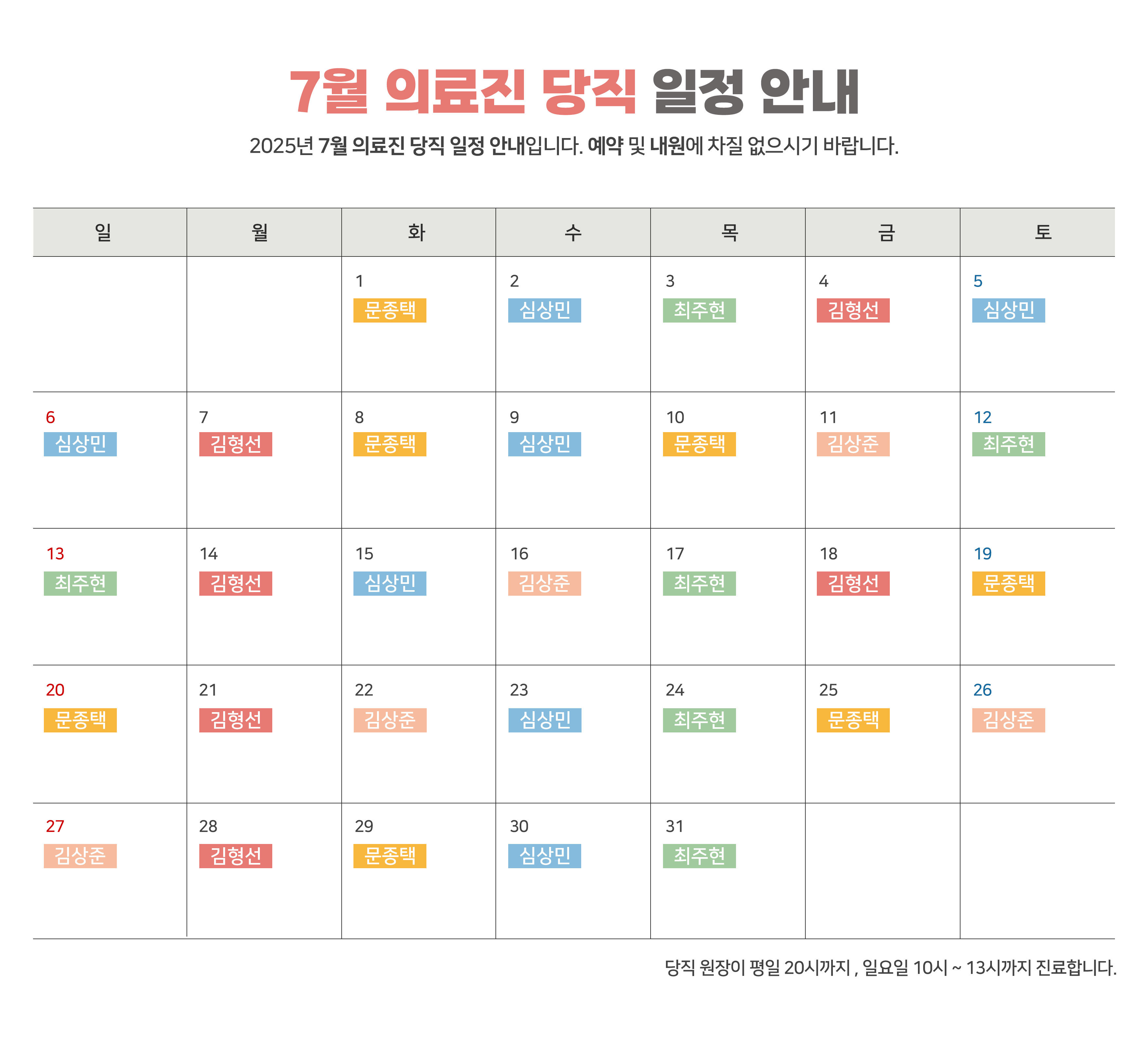 당직일정 리베르 여성병원 의료진의 당직일정을 빠르고 간편하게 확인하세요 7월 당직일정 작성자 liberwhospital 작성일 2025-06-23 10:11 조회 1614 좋아요 0 싫어요 0 인쇄 « 6월 당직일정 8월 당직일정 » 목록보기