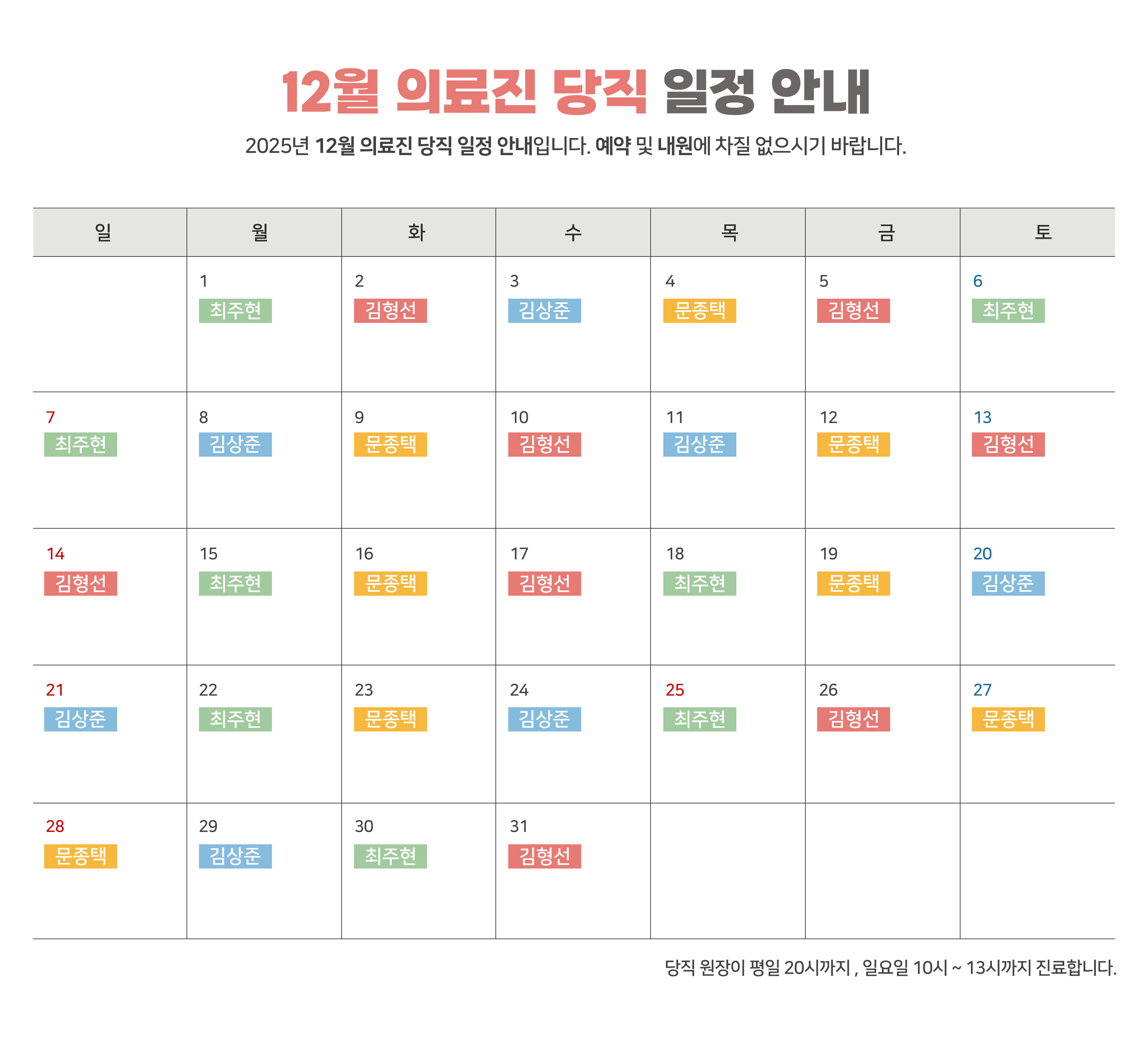 당직일정 리베르 여성병원 의료진의 당직일정을 빠르고 간편하게 확인하세요 12월 당직일정 작성자 liberwhospital 작성일 2025-11-04 10:38 조회 95 좋아요 0 싫어요 0 인쇄 « 11월 당직일정 목록보기